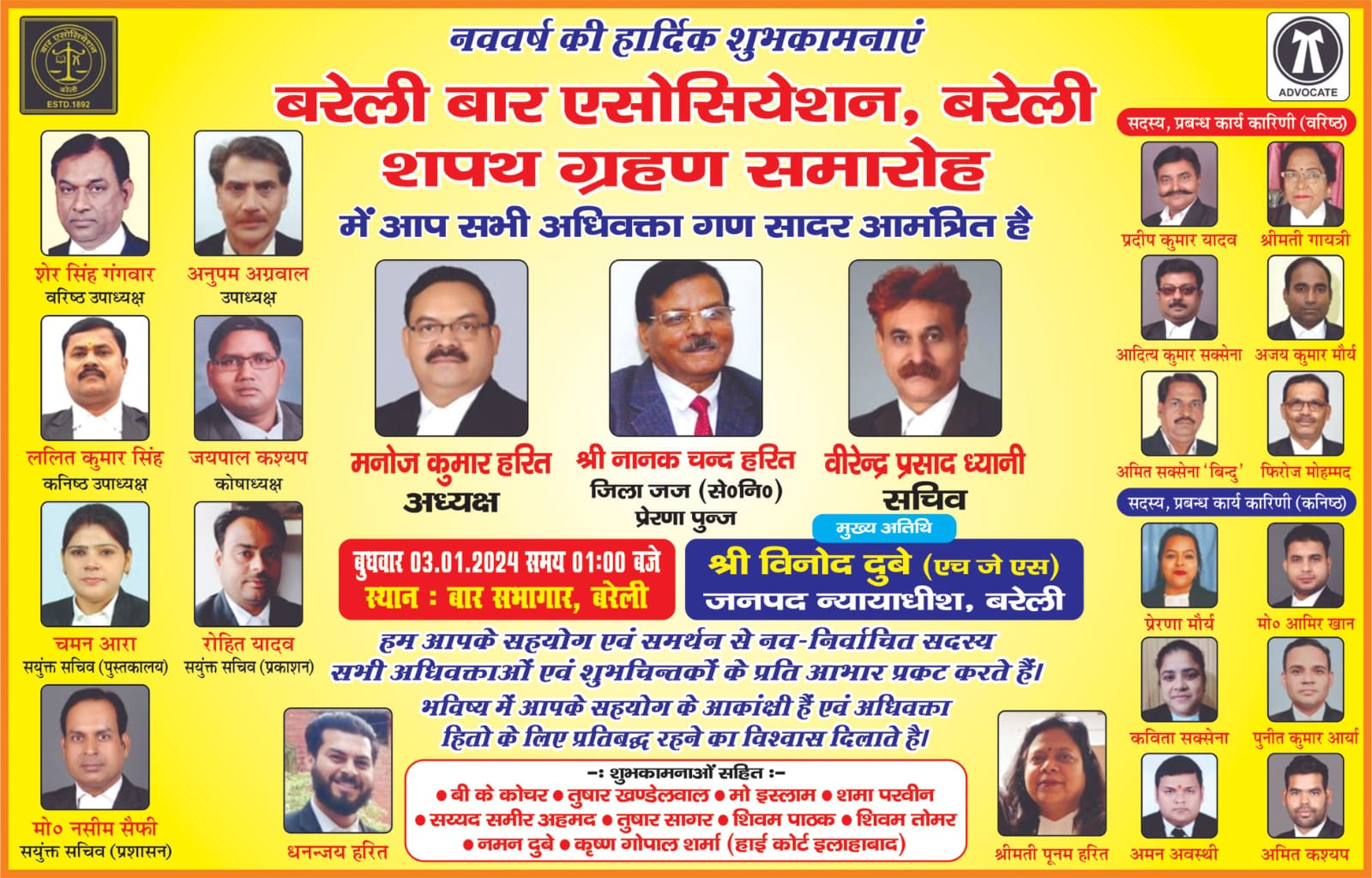 बरेली बार एसोसिएशन का शपथ ग्रहण होगा कल, भव्य समारोह की तैयारियां पूरी