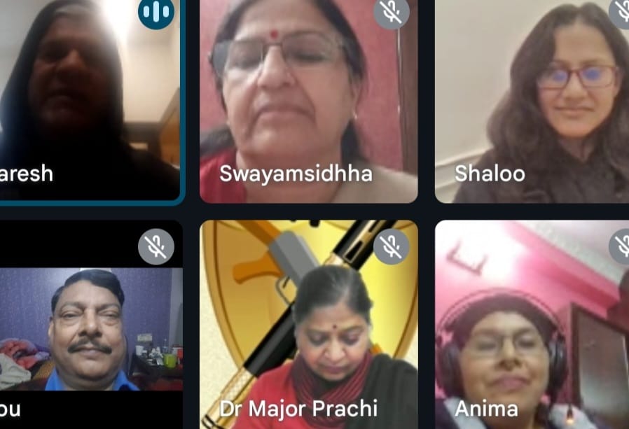 बरेली। सैन्य, अर्ध सैन्य एवं पुलिस परिवारों से संबंधित कवि एवं कवियत्रियों की अंतर्राष्ट्रीय संस्था प्रहरी मंच की गोष्ठी गूगल मीट पर आयोजित की गई। इस राष्ट्रीय गोष्ठी में मुख्य आतिथ्य राष्ट्रीय गज़लकार नरेश नाज़, अध्यक्षता ग्लोबल प्रेसिडेंट प्रख्यात कवियत्री शालू गुप्ता एवं संचालन राष्ट्रीय अध्यक्षा कवियत्री डॉक्टर मेजर प्राची गर्ग ने बहुत सुंदर रूप में किया।